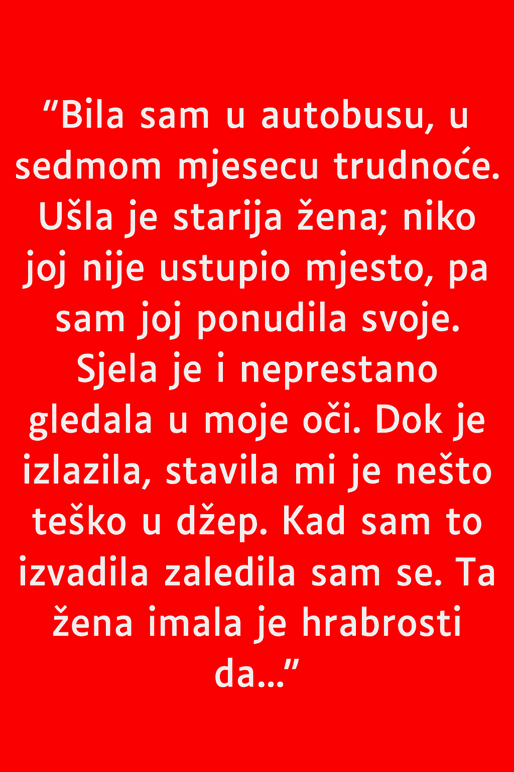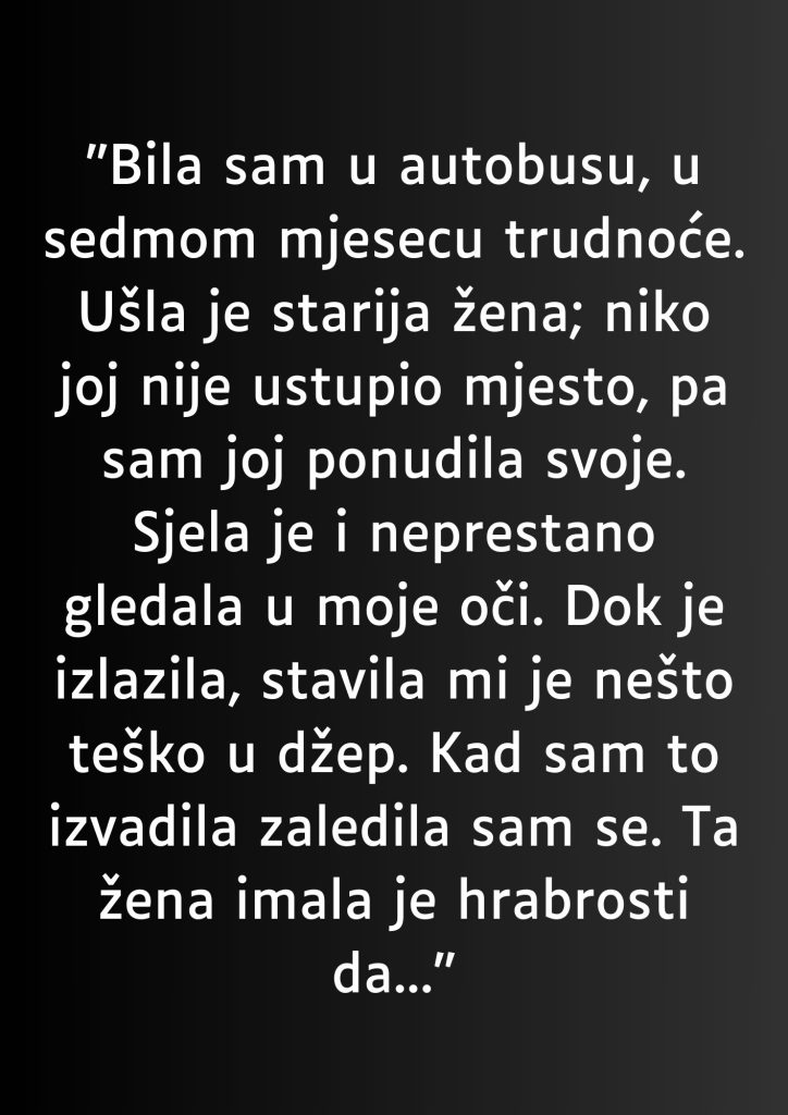 Na kraju, ova priča nas uči da se dobrota ne mjeri time kako je drugi primaju, nego time koliko smo spremni davati bez očekivanja. Trudnica iz autobusa nije izgubila vjeru u ljude – naprotiv, učvrstila ju je. Jer svijet se ne mijenja velikim gestovima, nego malim djelima koja nose toplinu i vjeru. Ako svako od nas odluči biti taj jedan osmijeh, jedno ustupljeno mjesto, jedna topla riječ, možda više nikome neće biti potrebno da nosi kamen u džepu kako bi se sjetio da život može biti i lakši – ako ga dijelimo s drugima.