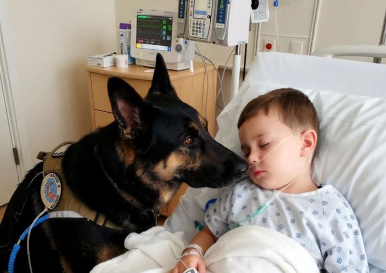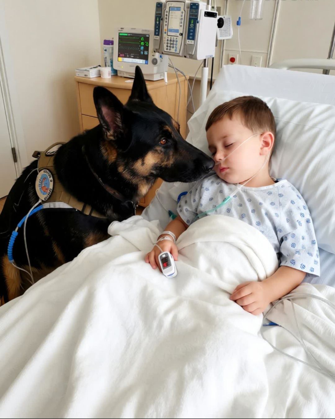 Rico se kretao polako, gotovo svečano, kao da razumije gdje se nalazi. Prišao je bolničkom krevetu, podigao se na zadnje noge i nježno položio prednje šape na ivicu kreveta. Nije lajao, nije cvilio. Samo je gledao dječaka, a zatim ga nježno polizao po kosi, kao da mu pokušava preneti svoju snagu i prisutnost. Lagano je pritisnuo šapama dječakova prsa, kao da mu poručuje da nije sam.