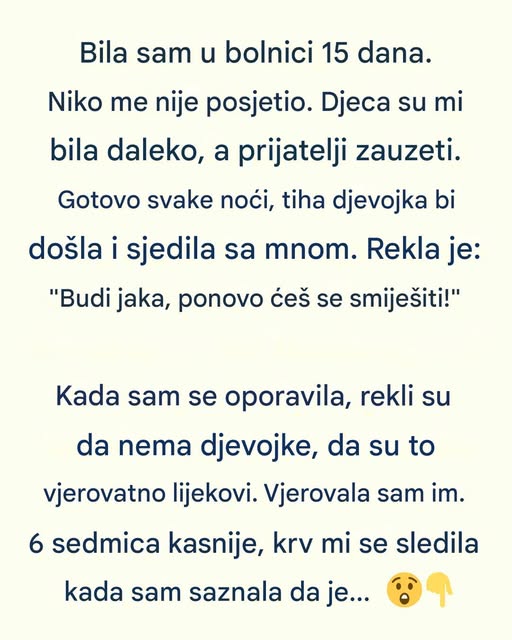 Ali tada je došla ona – tiha devojčica sa tamnom kosom, koja je ušla u moj svet u toj tišini, a njen dolazak bio je poput svetla koje je počelo da se probija kroz mrak. Svake noći, sedela je pored mog kreveta, bez ijedne reči, samo svojim prisustvom. Iako nisam znala ko je, njeno prisustvo bilo je kao oslonac, kao nežan podsetnik da nisam potpuno sama. Taj tihi osmeh i mir koje je nosila postali su moj spas.