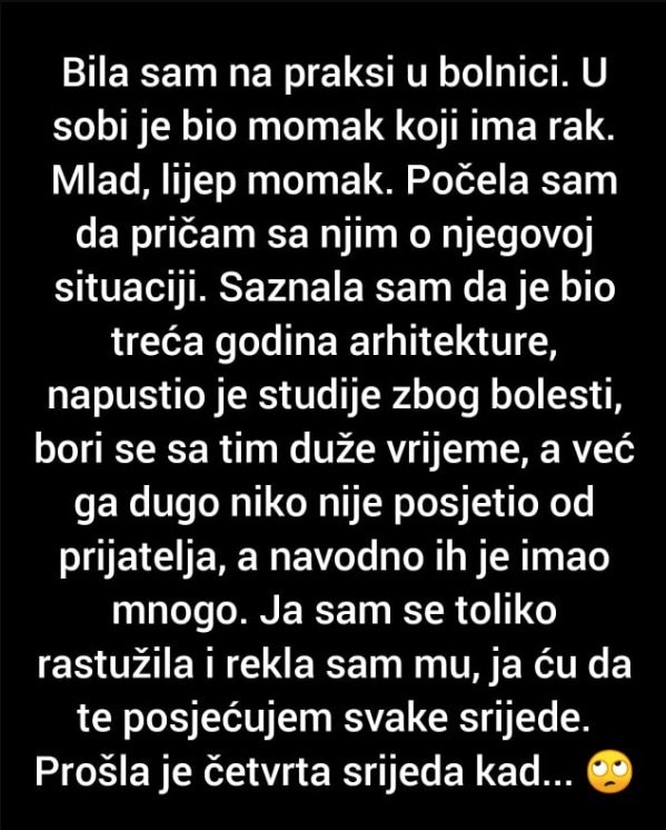 - Njegovo stanje je bilo duboko dirljivo, a Danira je osetila potrebu da mu pruži podršku i olakša dane provedene u bolnici. Iako je bio okružen ljudima dok je bio zdrav, bolest je učinila da mnogi od tih prijatelja nestanu iz njegovog života. Ovo je Daniru duboko rastužilo i postavila je sebi cilj da ga ne ostavi u njegovoj borbi. Obavezala se da će dolaziti svaki put, u sredu, i pokušati da mu pruži utjehu i prijateljsku podršku.