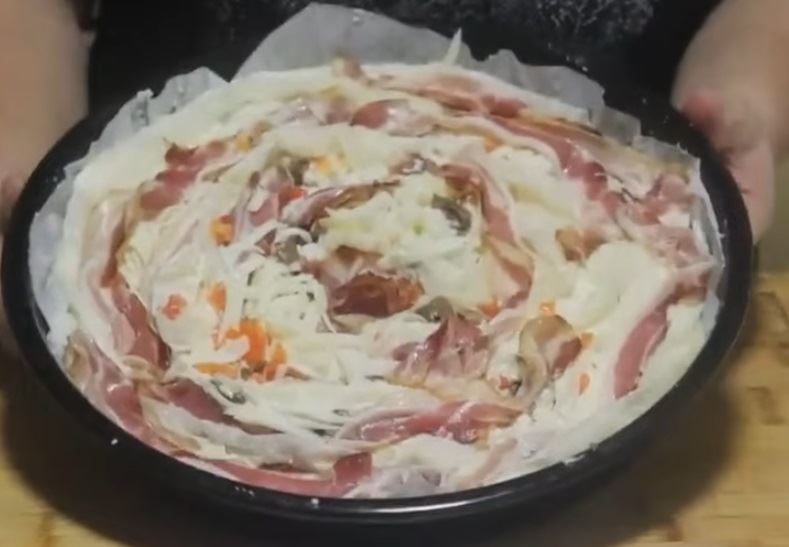 Na radnu površinu se raširi jedna kora za pitu i premaže pripremljenim filom. Preko fila se ravnomerno pospu seckana crvena paprika, masline, rendani sir koji se topi i sitno seckana dimljena slanina. Kora se zatim pažljivo urola, kao klasična pita, i odlaže u pleh koji je prethodno blago podmazan.