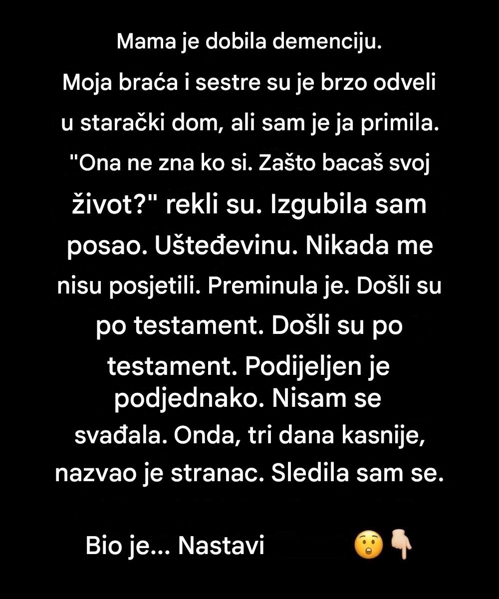 • Kroz sve ove izazove, briga o majci mi je donela ne samo teškoće, već i dar koji nosim sa sobom. Naučila sam šta znači biti čovek, šta znači ljubav – i kako se ona manifestuje kroz služenje. To je putovanje koje me, iako je bilo ispunjeno tugom, oblikovalo u jaču, mudriju i suosjećajniju osobu. Na kraju, ne sećam se samo umora, već duboke povezanosti koju smo izgradile. To je dar koji ostaje zauvek.