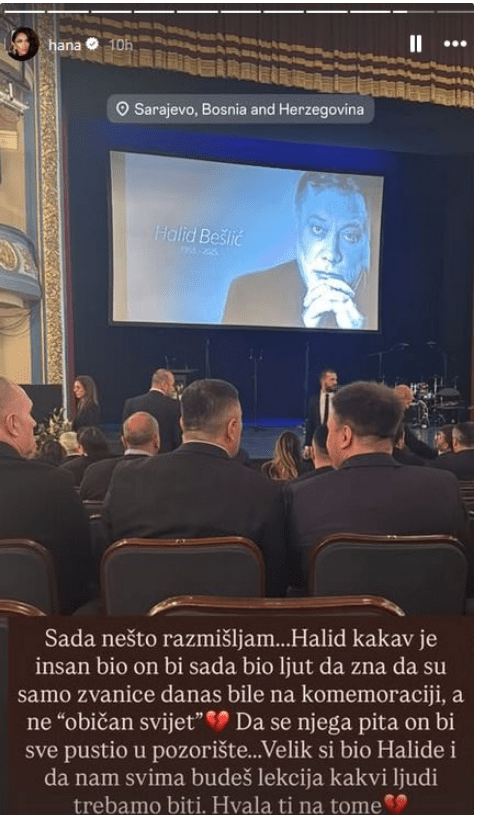 Da se on pitao, on bi sve pustio u pozorište” – napisala je ona, govoreći o tome kako bi pevač želeo da svi, bez obzira na status, imaju priliku da mu se poklone. “Veliki si bio, Halide, i da nam svida budeš lekcija kakvi ljudi trebamo biti. Hvala ti na tome” – poručila je Hana, naglašavajući da je Halid svojim životom i delom postavio visok standard kako bi ljudi trebali da se ponašaju jedni prema drugima.