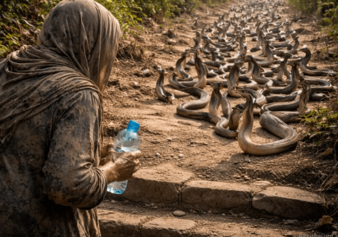 Žena je stajala na svom pragu, gledajući preplavljene stepenice i mnoštvo zmija koje su sada bile oko nje. Osećala je kako joj srce kuca brže, ali nije imala snage da se pomeri. Svaka zmija bila je opasna, a ona nije imala načina da se brani. U tom trenutku, shvatila je još jednu stvar — nije samo pomogla jednoj zmiji, već je svojim činom izazvala lančanu reakciju, nešto što je izmaklo kontroli. Zmije su došle zbog nje, zbog te jedne boce vode.