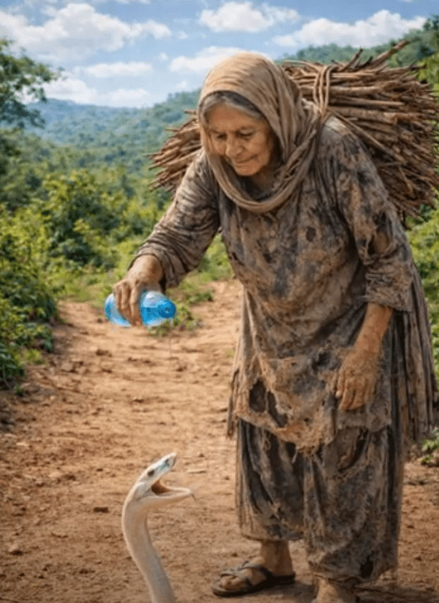Iako je srce bilo ispunjeno strahom, žena je osećala sažaljenje prema ovoj životinji koja je očigledno umirala. U tom trenutku, pomislila je da bi zmiji mogla pomoći. Pomislila je da joj treba samo voda, jer je saznala koliko je vrućina bila iscrpljujuća za sve. Polako je spustila paket drva na tlo, izvadila poslednje kapi iz svoje boce i tiho izlila vodu ka zmiji. Prvo ništa nije reagovala. Ali zatim, zmija je lagano pomerila glavu, njeno telo počelo da se budi. Ubrzo je počela da pije kapljice vode, i to je izgledalo kao da je našla svoju jedinu šansu za preživljavanje.