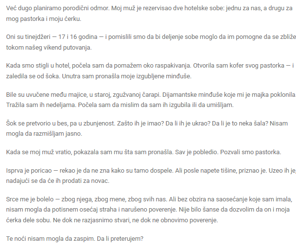 • Kada je Marko došao kući, odmah je primetio da nešto nije u redu. Njegov pogled bio je izbegavajući, a kada sam ga pitala o sadržaju kofera, odgovorio je samo: „Nisam tebe želeo uvući u sve ovo.” Srce mi je bilo teško. Sjedila sam, gledajući svog pastorka, i shvatila da ni on nije bio isti mladić kojeg sam poznala. Zamišljala sam ga kao onog dobrog, ljubaznog mladića, ali sada je bio suočen s nečim što je bilo izvan mojih očekivanja.