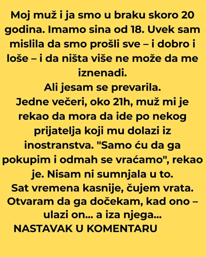 Gotovo dvadeset godina braka stvaraju osjećaj sigurnosti. Rutine, zajedničke uspomene, dijete koje je odraslo pred očima, preživljene krize i male pobjede. Ona je vjerovala da su prošli sve – i loše dane, i finansijske brige, i nesuglasice koje su s vremenom utihnule. Vjerovala je da su izgradili nešto čvrsto, nešto što više ništa ne može ozbiljno poljuljati.