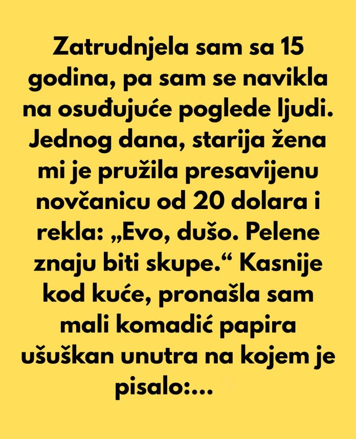Jednog dana, dok je sjedila umorna i izgubljena u vlastitim mislima, prišla joj je starija žena. Nije bilo dugog razgovora, niti pitanja koja bi dodatno opteretila situaciju. Samo jednostavan gest — novčanica od dvadeset dolara pružena bez mnogo riječi.