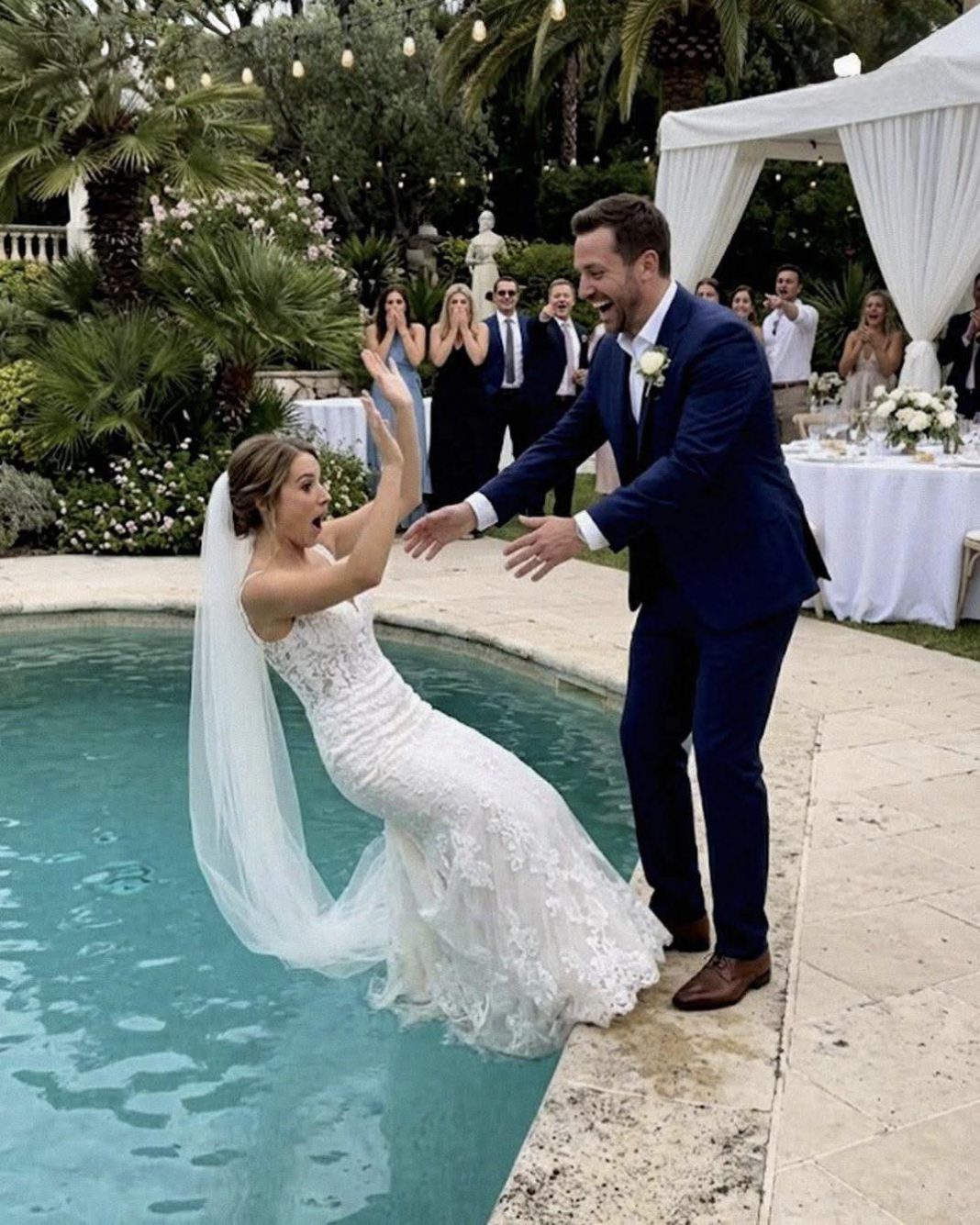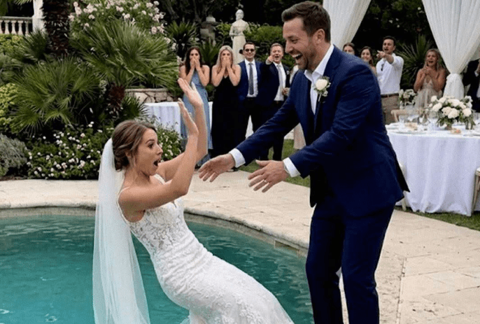 Međutim, ono što se dogodilo ubrzo nakon ceremonije potpuno je promenilo tok svadbenog slavlja. Dok su konobari nosili čaše šampanjca, a gosti uživali u veselju, Teodor je uzeo mikrofon i najavio iznenađenje. Svi su očekivali romantičan govor, možda još neko dirljivo obraćanje mlade, ali ono što je usledilo nije bilo ništa od toga. Teodor je, u šali, gurnuo mladu prema bazenu, a ona je, iznenađena i nespretna, pala u vodu. Njena vjenčanica je plutala na površini bazena, a gosti su ostali u šoku. Neki su počeli da se smeju, misleći da je to samo šala, dok su drugi stajali zbunjeni, pitajući se da li je ovo stvarno bio deo plana. Reakcija samog Teodora bila je neverovatna – i dalje je mislio da je sve to zabava, mislio je da je stvorio savršen trenutak za smeh i zabavu, ne shvatajući dubinu neugodnosti koju je izazvao.