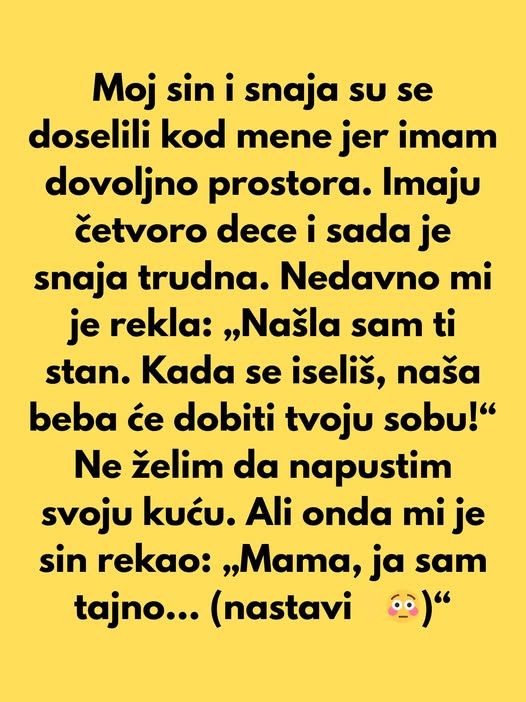 - Iako je tvoje prilagođavanje ovoj situaciji potpuno razumljivo, možda bi bilo korisno da otvoreno porazgovaraš sa sinom o tome kako se osećaš. Pokušaj mu objasniti koliko ti znači tvoj dom i koliko ti je teško da napustiš prostor u kojem su tvoje uspomene i u kojem se osećaš sigurno. Verovatno je on zauzet brigom o proširenju porodice i praktičnim pitanjima, ali važno je da i tvoje emocije budu prepoznate i uvažene. Možda postoji mogućnost da nađeš neko rešenje koje će obezbediti prostor za sve, ali i omogućiti tebi da zadržiš osećaj pripadnosti i važnosti u svojoj porodici.