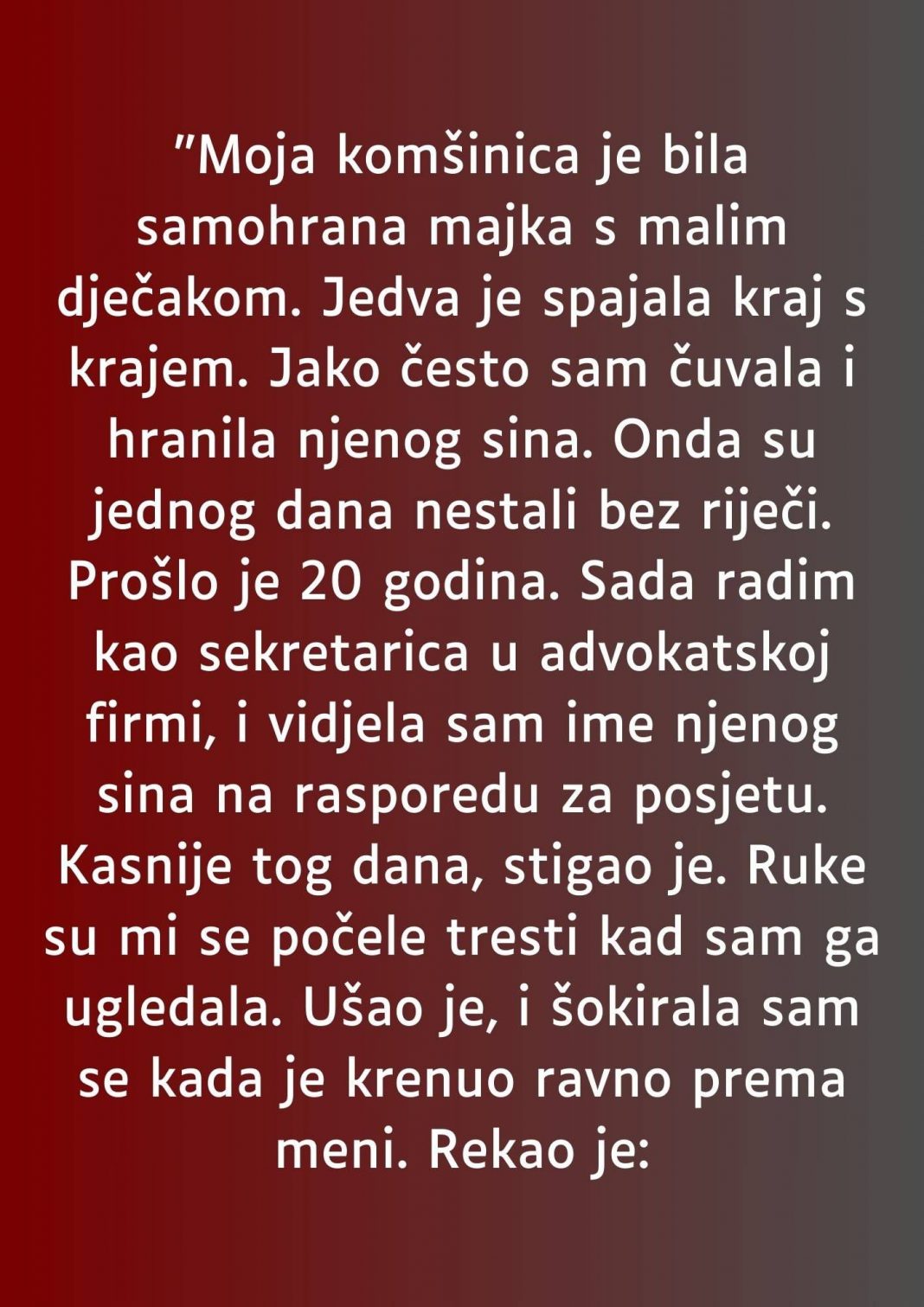 - Moja komšinica, žena u ranim tridesetim, doselila se u našu zgradu pre tri godine. Nikada nije bila glasna ni u centru pažnje, ali je imala jednu nevjerojatnu sposobnost – uvek je imala osmeh na licu. Bilo je očigledno da život nije bio lak za nju, ali ta snaga koju je nosila nije prolazila neprimećeno. Uvek je bila tiha i povučena, a zajedno sa njom, tu je bio njen mali sin – veseli, plavokosi dečak, kojeg je nosila iz jednog mesta na drugo. Njih dvoje su, činilo se, bili sami protiv sveta, suočeni sa svim izazovima života.
