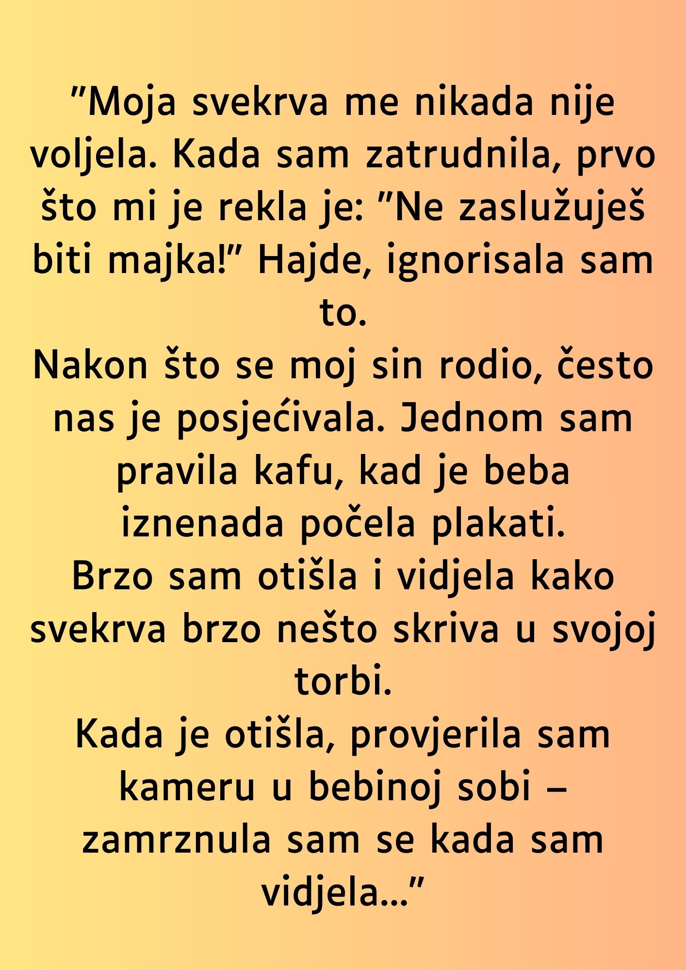Nakon što je njen sin došao na svijet, svekrva je počela češće dolaziti u posjete, što je u početku izgledalo kao pokušaj zbližavanja s unukom. Međutim, ubrzo se pokazalo da iza tih posjeta stoji nešto potpuno drugo. Jednog dana, dok je mlada majka pripremala kafu, čula je plač iz dječije sobe. Požurila je da vidi šta se događa, a prizor koji je zatekla bio je sumnjiv – svekrva je naglo sklonila nešto u svoju torbu. Tada još nije naslućivala šta se krije iza tog poteza, ali osjećala je da nešto nije u redu.