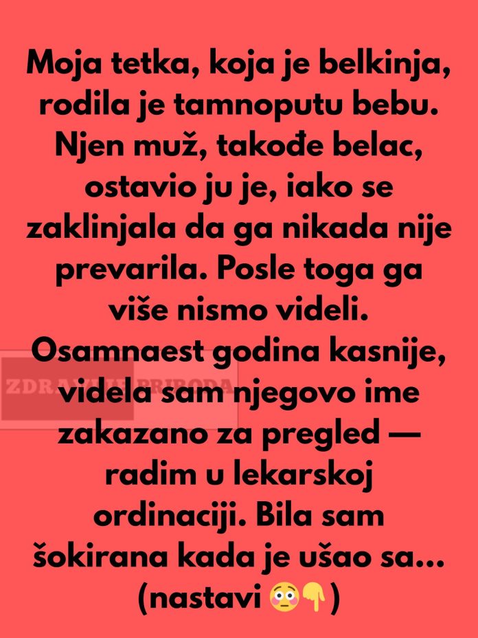 • Osamnaest godina kasnije, radila sam u jednoj ordinaciji i bila šokirana kad sam ugledala njegovo ime na zakazanom listiću za pregled. Čovjek koji je prije toliko godina napustio moju tetku i njihovog sina sada je stajao pred mojim očima. Došao je sa ženom i sinom, koji je, na moje iznenađenje, bio tamnoput. Iako sam bila potpuno zbunjena, nisam mogla da ne provjerim njegove podatke. Kada sam pogledala njegov karton, shvatila sam da su zaista bili njegova supruga i sin, i sve je postalo jasno. Ovaj mladi dečko, sa tamnijom kožom, bio je njegov sin, i to je potvrdilo nešto na što smo svi zaboravili — nije se radilo o prevari, niti o nekoj tajnoj vezi njegove žene, već o nečemu dubljem.