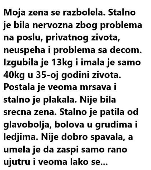 • U jednom trenutku, stres je prestao biti prolazno stanje i postao stalni pratilac njenog života. Tijelo je počelo slati signale upozorenja, ali oni su dugo bili ignorisani, jer je, kao i mnoge žene, navikla stavljati potrebe drugih ispred svojih.