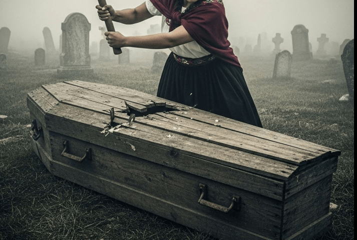 Zvuk pucanja drveta odjeknuo je grobljem. Jedan udarac. Zatim drugi. Drvo je popuštalo pod snagom, a ljudi su ostajali ukočeni. Niko nije vikao, niko se nije pomerio. Kao da je vreme stalo. Sveštenik je oborio glavu, neki su instinktivno okrenuli pogled, dok su drugi stajali prikovani prizorom.