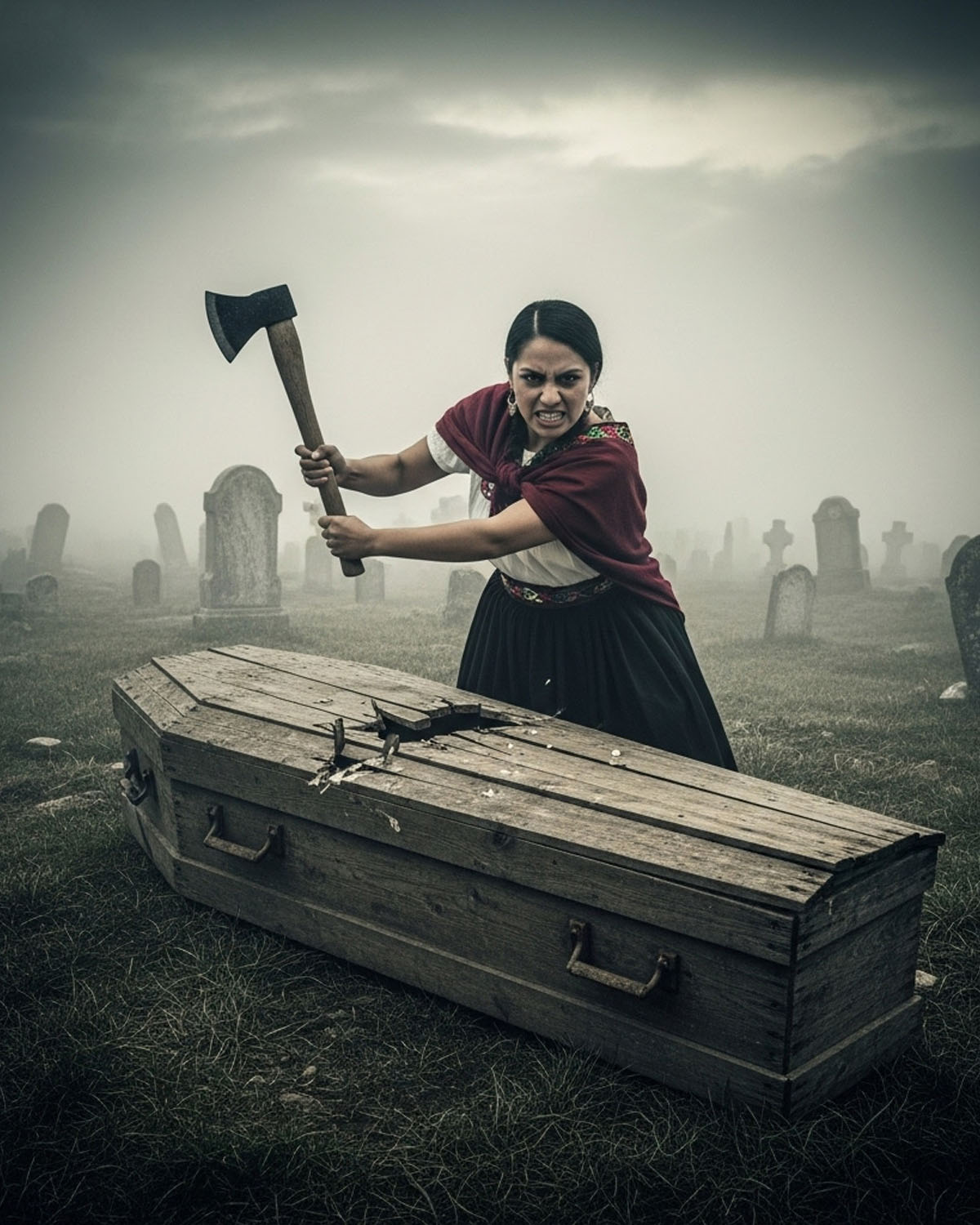 - Majka je iskoračila napred. Njeno lice bilo je bez boje, ali pogled jasan. Spustila je torbu na zemlju i iz nje izvadila sekiru. Pre nego što je iko stigao da reaguje, podigla ju je i snažno udarila po poklopcu kovčega.