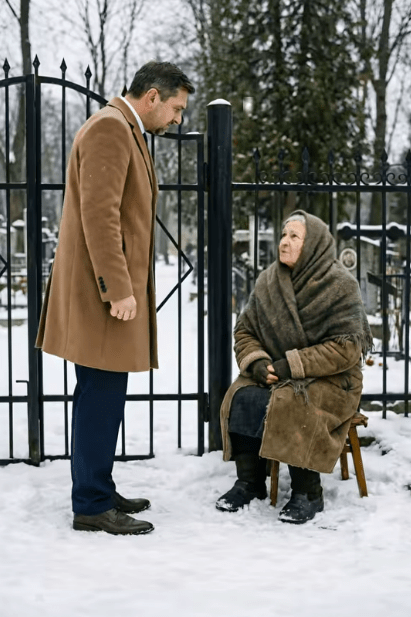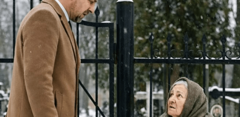 Kada je broj ljudi na groblju opao, vozač mu je tiho napomenuo da je automobil spreman za polazak. Polako je krenuo prema izlazu, a snijeg je padao kao da ga tješi sama priroda. Pred kapijom je ugledao staru ženu koja je sjedila pod starim nadstrešnicama. Pogurena, s tamnim maramom na glavi, sjedila je na maloj drvenoj stolici. Žena poput njih često se viđa na grobljima, pa se i on zaustavio, izvadio nekoliko novčanica iz novčanika i ponudio joj ih.