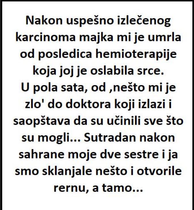 Smrt majke ne dolazi nikada u pravo vrijeme, ali ovdje je bol bila još teža jer je došla poslije nade. Poslije vjerovanja da će se život vratiti u normalu. Poslije planova, malih radosti i običnih razgovora. Ostala je praznina koja se ne da objasniti riječima, samo osjećajem koji steže grudi i ne popušta.