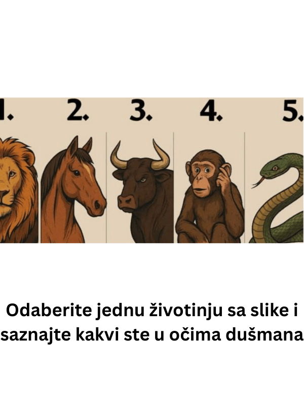 - Ovaj test ličnosti polazi od jednostavnog pitanja: koju životinju birate instinktivno, bez mnogo razmišljanja? Na izboru između lava, konja, bika, majmuna i zmije krije se način na koji vas doživljavaju vaši neprijatelji. Oni možda nikada neće reći naglas šta misle, ali njihov pogled govori jasno – i ponekad su njihove projekcije odraz vaše stvarne snage.