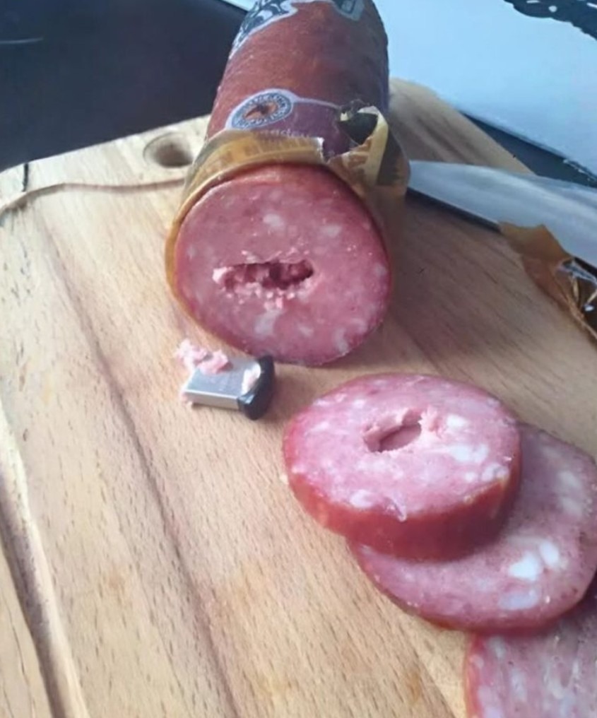 • Jednog uobičajenog dana, žena je svratila u supermarket, umorna i gladna, i odlučila kupiti paket kobasica. Cena je bila normalna, pakovanje je bilo zapečaćeno, ništa nije ukazivalo na to da bi moglo doći do nečega neobičnog. Kod kuće je spremila brzi sendvič i ostavila ostatak kobasica za doručak. Međutim, sutradan, dok je pripremala omlet, nož joj je naišao na nešto tvrdo u jednoj kobasici. Isprva je pomislila da su možda kobasice malo zaledile, ali se ubrzo ispostavilo da u njima postoji nešto sasvim neočekivano — USB uređaj, prekriven mesom i mašću.