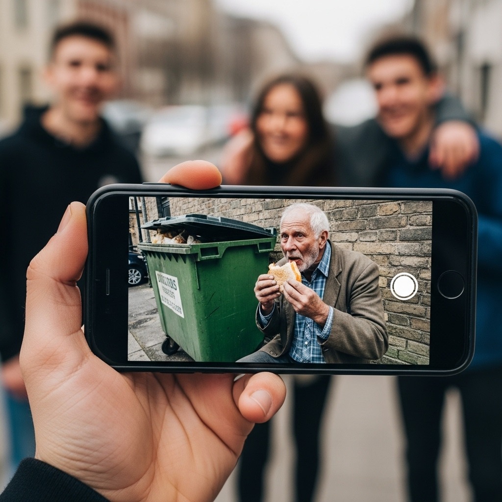Jednog popodneva, dok je s društvom lutao gradskim centrom u potrazi za sadržajem koji bi mogao postati viralan, Marko je ugledao prizor koji mu se učinio kao laka meta. Iza jedne pekare, pored kontejnera, stajao je stariji beskućnik, vidno iscrpljen, s drhtavim rukama i pogledom koji je nosio težinu dugogodišnje patnje. Bio je to Lazar, čovjek kojeg su stanovnici kraja odavno prestali da primjećuju. Dok je pokušavao da pojede ono malo hrane pronađene u smeću, nije ni slutio da postaje predmet poruge.