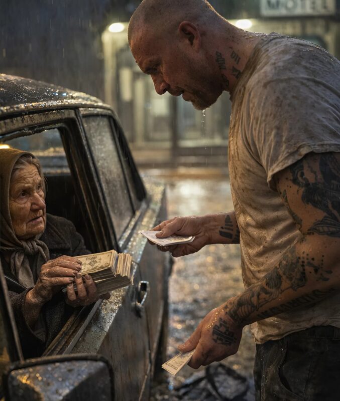 Kada su stigli do motela, kiša je i dalje padala, a muškarac je izašao iz automobila, otvorio svoju torbu i izvadio gomilu novca. Ne samo nekoliko novčanica, već ozbiljan paket novca vezan gumicom. Pružio joj je novac kroz prozor, govoreći joj da je ovo za njenu dobrotu i to što nije sudila ljudima po izgledu. Žena je bila zbunjena, nije mogla da veruje svojim očima. Kako je mogla da primi toliku sumu novca? “Ovo je previše,” rekla je, iznenađena njegovim postupkom.