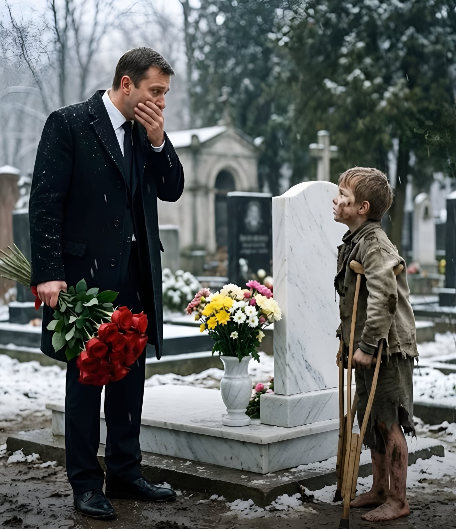 Međutim, sve se promenilo jednog kišnog dana, kada je, slučajno, ugledao dečaka pored groba. Bio je to mršavi dečko, koji je izgledao kao da se borio sa sopstvenim telom i kišom, oslanjajući se na improvizovani štap. Njegov pogled bio je prepun bola i tuge, ali u njemu je Alex prepoznao nešto što nije mogao da objasni. Zbunjeno je prišao, a dečak je tiho izgovorio reč koja mu je oduzela dah: „Tata… ja sam. Živ sam.“