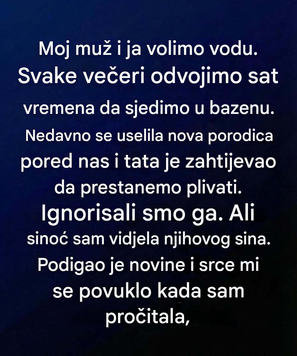 • Prava istina, međutim, izašla je na vidjelo na način koji niko nije očekivao. Jedne večeri, dok su se supružnici brisali peškirima pored bazena, primijetili su dječaka kako tiho stoji uz ogradu. U rukama je držao mali papirić. Nije govorio ništa, samo ga je pružio. Kada su pročitali poruku, svijet im se na trenutak zaustavio. Riječi su bile jednostavne, ispisane dječjim rukopisom, ali su nosile ogromnu težinu. U poruci je pisalo da njegova mlađa sestra ima ozbiljne zdravstvene probleme i da joj zvuk vode noću pomaže da se smiri i zaspi. Sportske vesti su prenijele da je upravo taj trenutak bio prelomna tačka cijele priče, jer su supružnici shvatili koliko su pogrešno protumačili ponašanje svojih komšija.