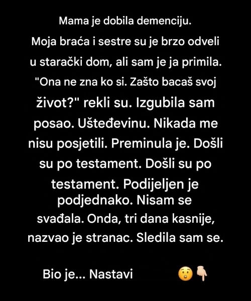 Nekoliko dana kasnije, zazvonio je telefon. Javila se osoba iz njene prošlosti, bivši kolega. Rekao mi je da mi je majka, dok je još bila svjesna, ostavila mali račun i pismo. Nije to bio iznos koji mijenja život. Ali riječi su promijenile mene. Zahvalila mi je na strpljenju, na ljubavi, na tome što sam ostala. Tada sam shvatila da sjećanje može izblijediti, ali osjećaj ostaje.