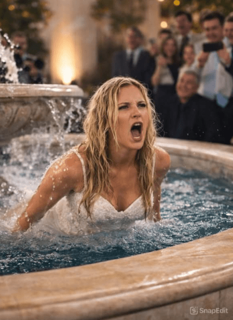 Ali tada, u sekundi koja je promijenila sve, dogodilo se nešto što niko nije očekivao. Umjesto da joj pomogne da se vrati u uspravan položaj, mladoženja ju je iznenada gurnuo u fontanu. Nevjesta je izgubila ravnotežu i pala u vodu, dok su se gosti u nevjerici trzali i uzdahnuli. Njena haljina se natopila, postala teška, kosa joj se raspala, a cijela scena pretvorila se iz romantične u ponižavajuću.