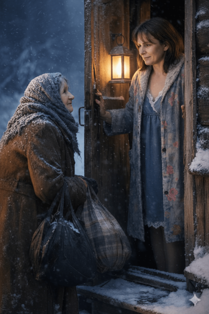 - Jedne zimske noći, dok je razmišljala o tome šta joj predstoji, iznenada je začula tiho, nesigurno kucanje na vratima. Zima je bila surova, a snežna mećava je besnela. Kucanje je bilo neobično tiho, ali jasno dovoljno da je primeti. Zatekla je staricu na pragu njene kuće, smrznutu i drhtavu, koja je molila za pomoć. Tražila je samo da prespava u njenoj kući, jer je bila potpuno smrznuta. Žena je bila zbunjena, nije znala šta da radi. Nije imala mnogo da ponudi, ali duboko u svom srcu znala je da mora učiniti ono što je ispravno. Otpustila je sumnju i otvorila vrata, pozivajući staricu u svoj skromni dom.