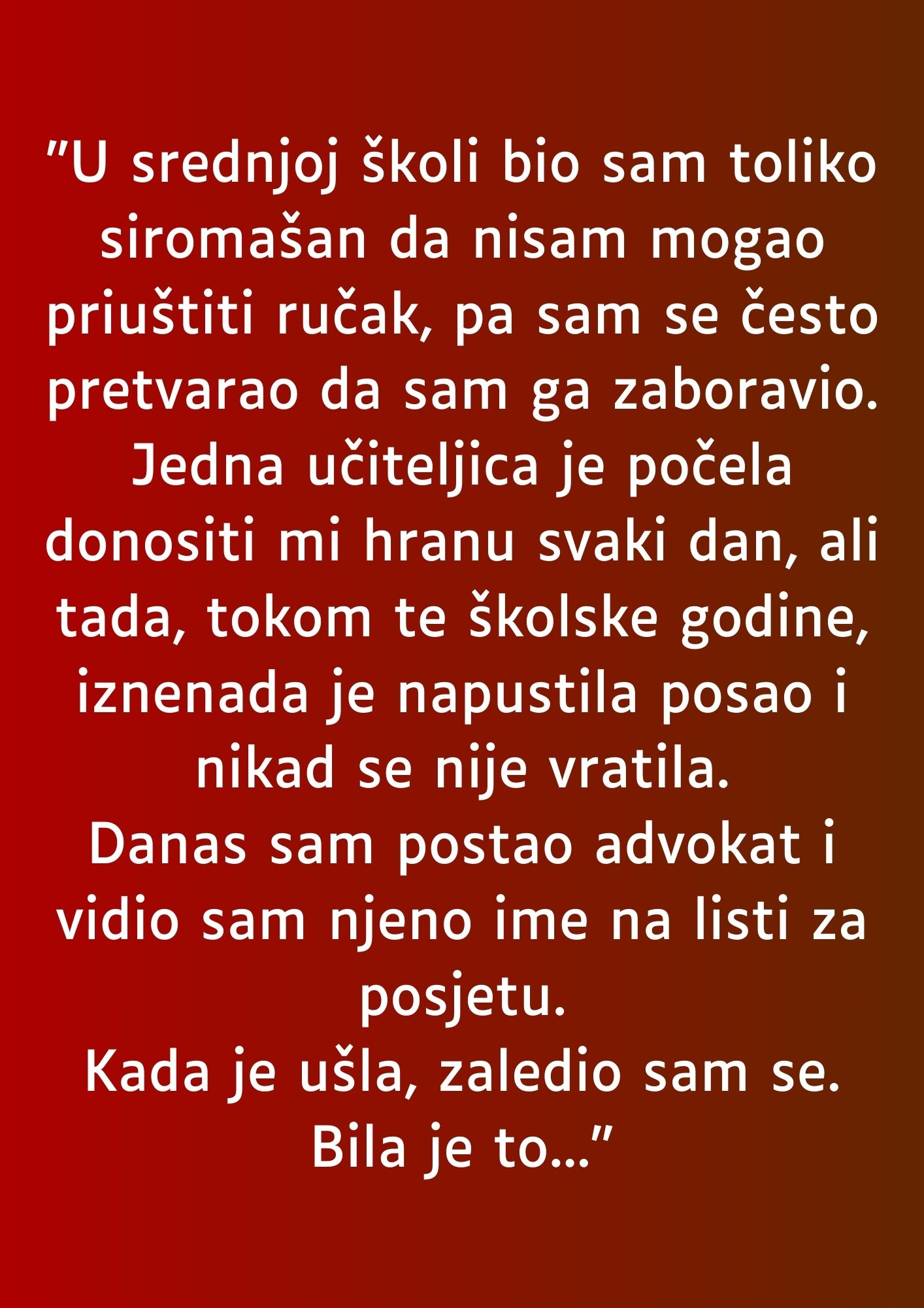 - Tokom srednjoškolskih dana, glavni junak ove priče živeo je na ivici siromaštva. Bio je dete koje je svakog jutra išlo u školu sa istom brigom – kako izdržati dan bez ručka. Nije želeo sažaljenje, nije želeo pitanja, pa je često govorio da je obrok zaboravio kod kuće. Tišina mu je bila lakša od priznanja da nema.