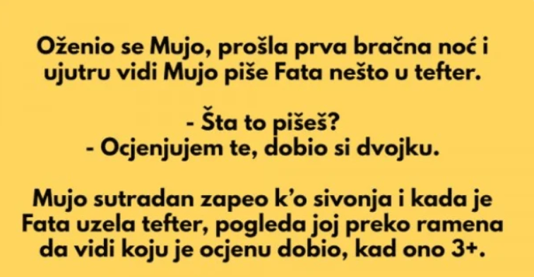 Mujo sutradan zapeo k’o sivonja i kada je Fata uzela tefter, pogleda joj preko ramena da vidi koju je ocjenu dobio, kad ono 3+.