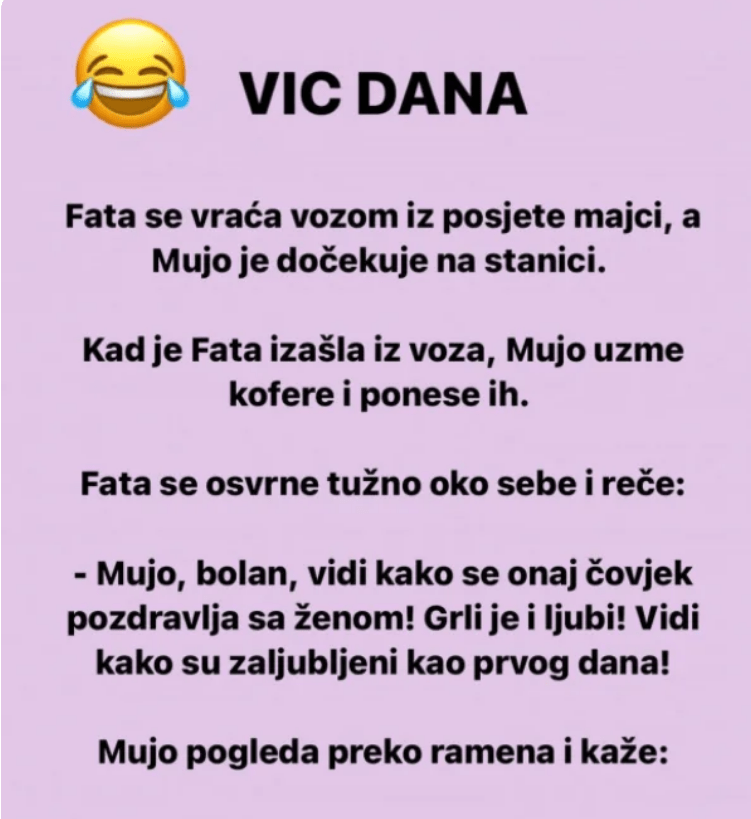 – Mujo, bolan, vidi kako se onaj čovjek pozdravlja sa ženom! Grli je i ljubi! Vidi kako su zaljubljeni kao prvog dana!