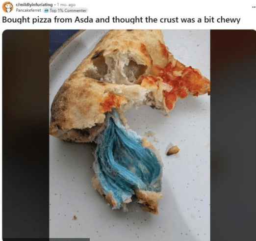 - Mladić je 16. jula ove godine odlučio da uživa u pici iz zamrzivača. Nakon što je ispekao picu u rerni, zagrizao je prvi zalogaj, ali nije mogao da veruje šta je osetio. Na početku je pomislio da je korica samo žilava, ali kada je bolje pogledao, shvatio je da to nije uobičajena korica. Na njegovom zalogaju je bila plavkasta tkanina ili nešto što je izgledalo kao plastika, što je izazvalo njegov šok. Mladić je na društvenim mrežama podelio fotografiju pice, koja je jasno prikazivala predmet u testu, što je izazvalo buru reakcija među korisnicima interneta.